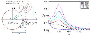 2三裂纹的示意图(a);不同情况下裂纹1周围的应力强度因子(b)