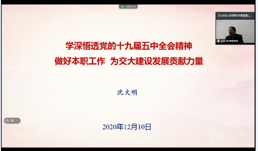 12月10日下午15:00力学与工程学院全体教职工党支部和学工组通过腾讯会议线上形式,集体听取了校党委副书记沈火明教授题为《学深悟透党的十九届五中全会精神,做好本职工作,为交大建设发展贡献力量》专题党课,