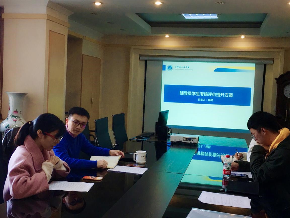 寒假期间,全体辅导员就各自分管工作的提升措施进行了深入思考并拟定了方案。会上,主要就辅导员学生考核评价提升方案、学生园区双率排名提升方案,研究生精品项目方案、团委考评提升建议方案、班级联合会(学业发展中心)建设方案以及本科毕业生双率提升方案等进行了交流、探讨。