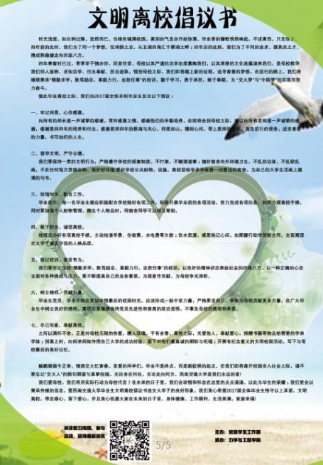 本次活动主要分为四个阶段,第一阶段制作毕业生文明离校倡议书,印制成海报形式张贴于各园区宣传栏及L型展板于食堂门口。同时,将倡议书传单面向全校毕业生进行发放。通过倡议书的内容引起毕业生的共鸣,让毕业生能够自觉做到文明离校、爱校、荣校。