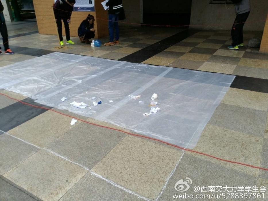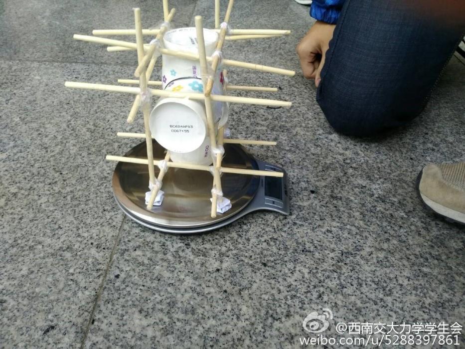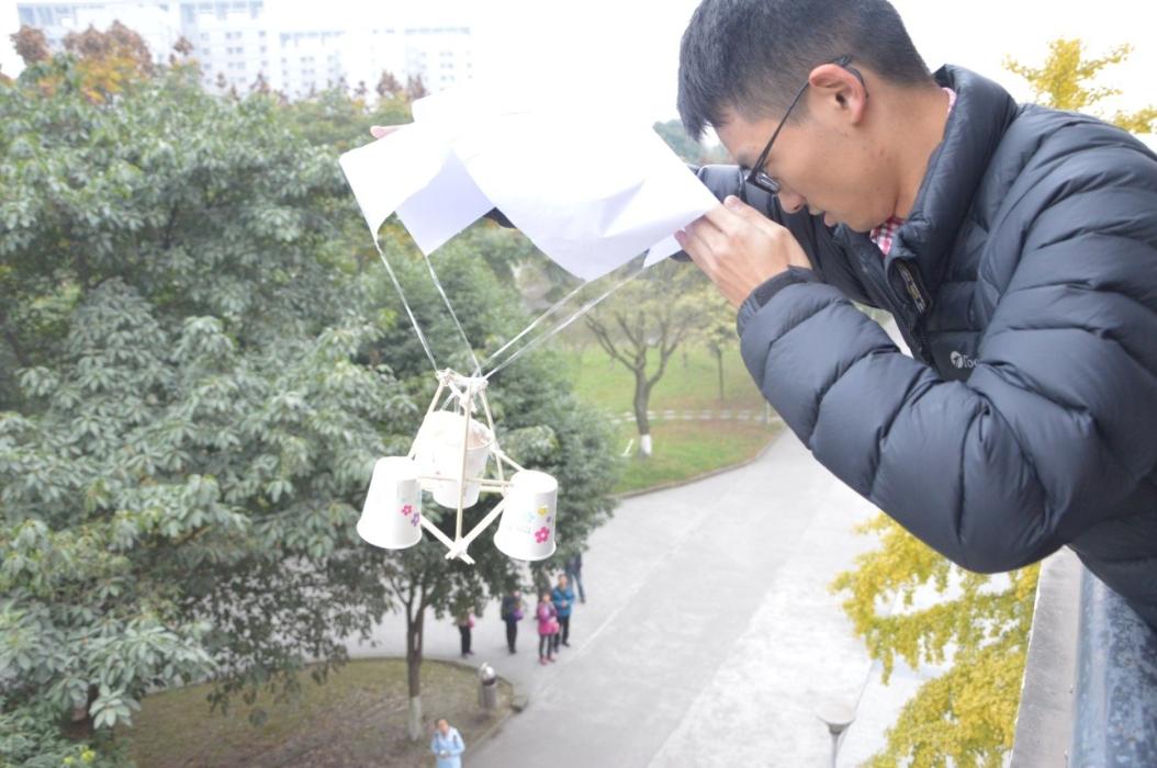 这次初赛提供材料有一次性纸杯4个、A430张、一次性筷子10双、气球2个、胶水1瓶、透明胶1个,选手需在完成的装置中装上鸡蛋,从2教三楼让其自由落下。