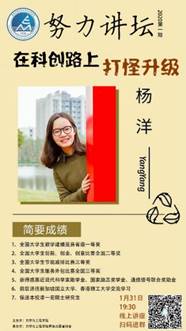 2020131日晚730,努力讲坛第一期准时开讲。本期讲坛由来自信息学院的杨洋同学担任主讲人,力学学院青年志愿者协会蒋粤洋同学担任主持人,讲授主题为“科创之美”。
