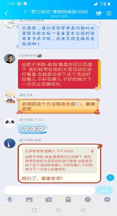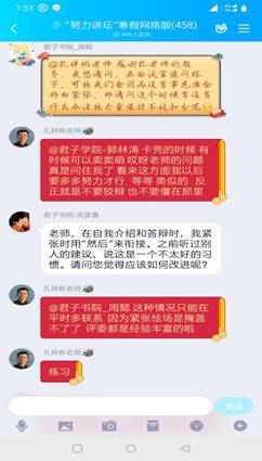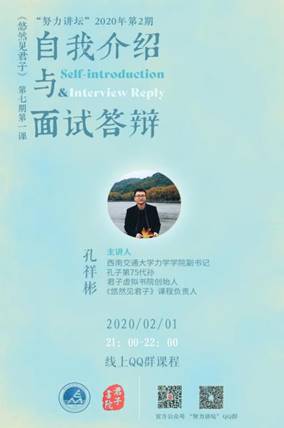 202021日晚9:00努力讲坛第二期课程《有效沟通之自我介绍与面试答辩》努力讲坛寒假网络版QQ群中举办,本期课程由孔祥彬老师主讲,力学学院18级本科生杨静雷担任主持人,全校共计数百位同学参与学习了此次课程内容。