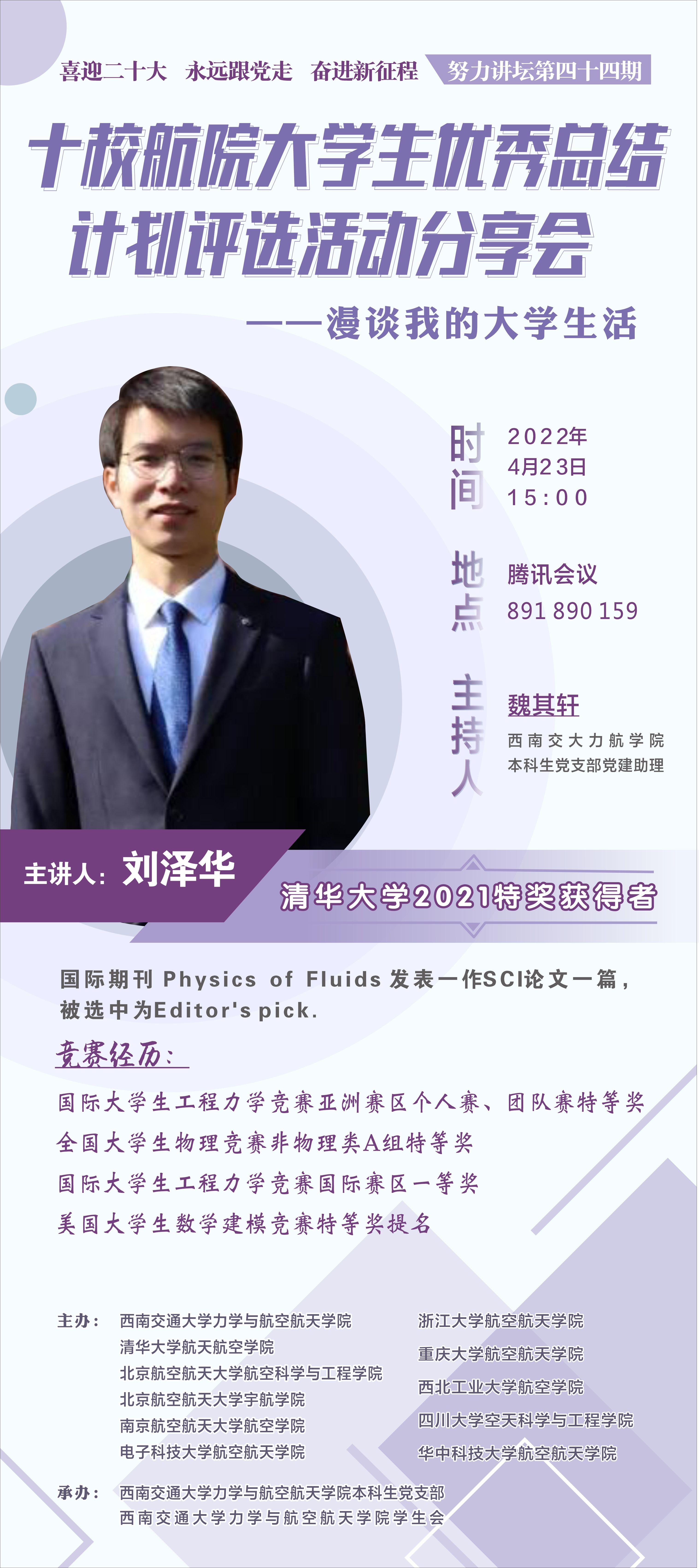 2022年4月23日下午,十校航院大学生优秀总结计划评选活动分享会暨“努力讲坛”第四十四期“漫谈我的大学生活”顺利开展,本次活动由西南交大、清华、北航、南航、浙大、西工大、华科、川大、重大、电子科大十校航院主办,西南交通大学力学与航空航天学院本科生党支部、学生会承办。本次活动以线上分享的方式进行,主讲嘉宾为清华大学航天航空学院2018级本科生、清华大学2021特奖获得者刘泽华,本次活动由91直播