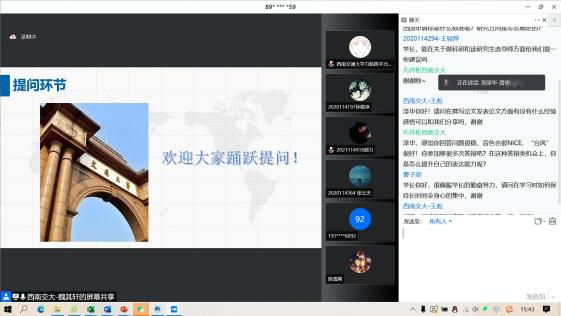 最后是提问环节,参与活动的同学从学习习惯、科创竞赛、论文发表等方面提出了相关问题,刘泽华同学针对这些问题,结合自身经历做出了详细的解答并推荐了自己喜欢的科研书籍。