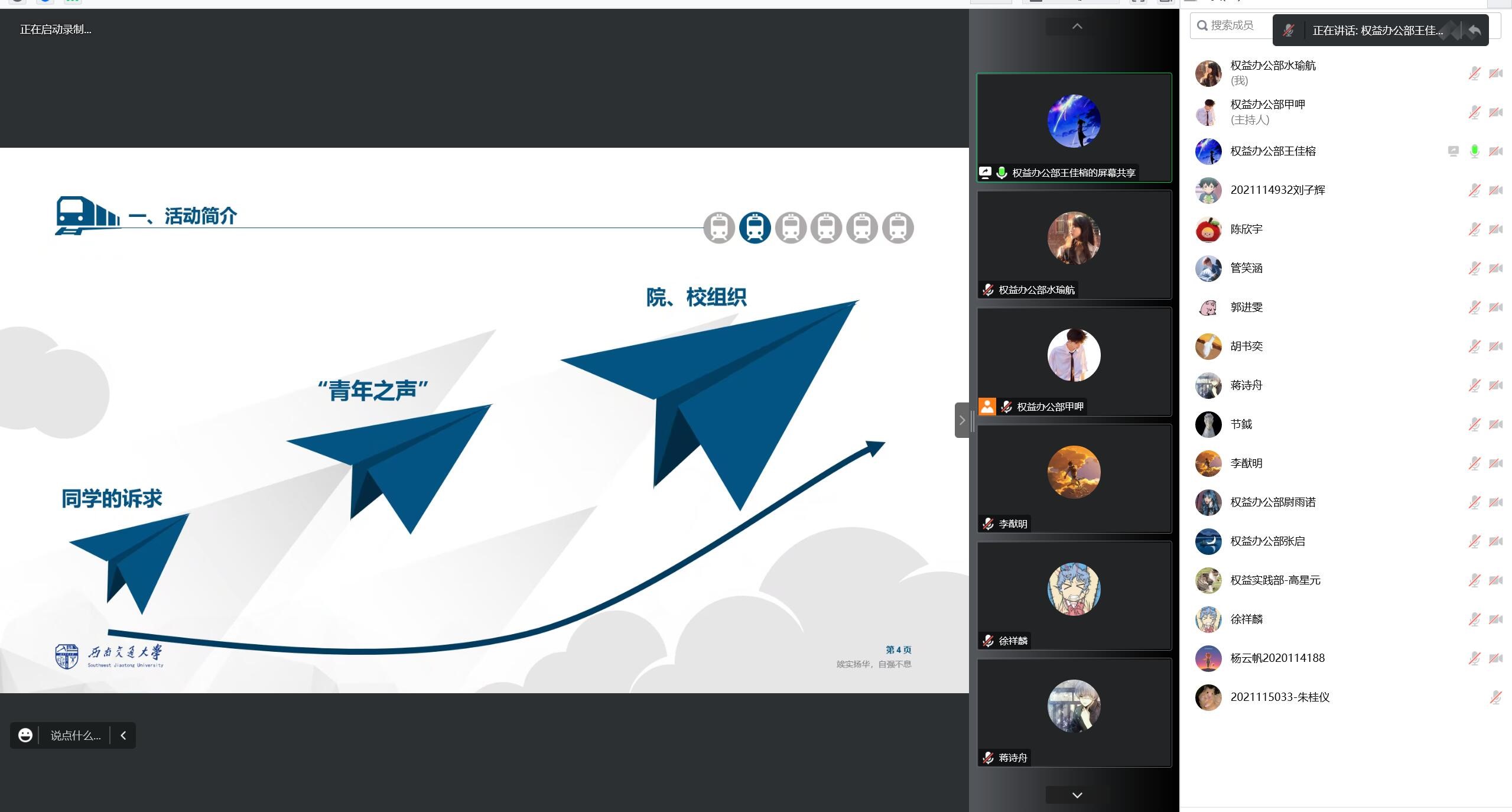 此外,王佳榕同学还在会上介绍了权益工作的处理流程以及各位工作人员的具体分工。其中,收集提案、信息反馈均采用线上线下并行模式,以保证每一个学生的声音都被听见,都能得到有效的回应。