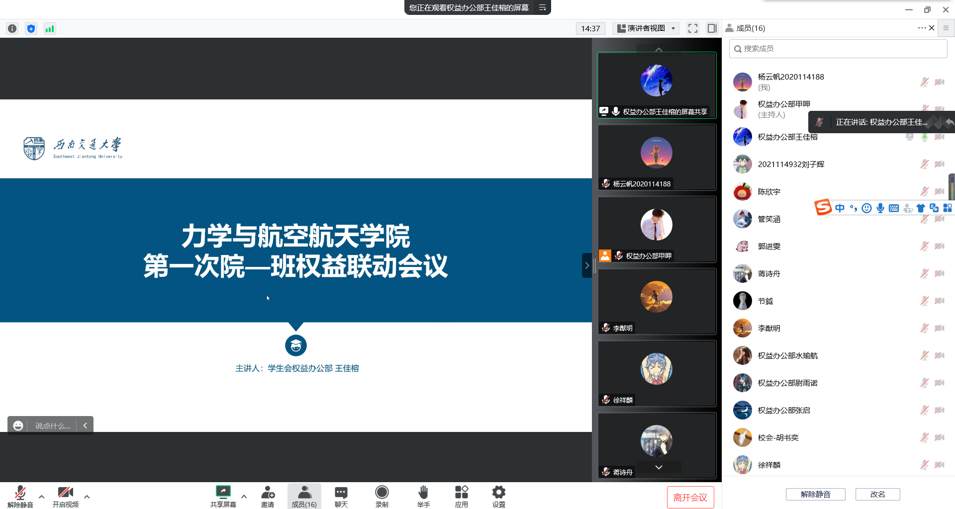 学生会权益办公部召开了院-班学生权益联动会议。本次会议线上举行采取线上举行,会议由力航学院学生会权益办公部王佳榕、甲呷同学主持,学院各班权益委员和学生会相关工作人员参加了本次会议。