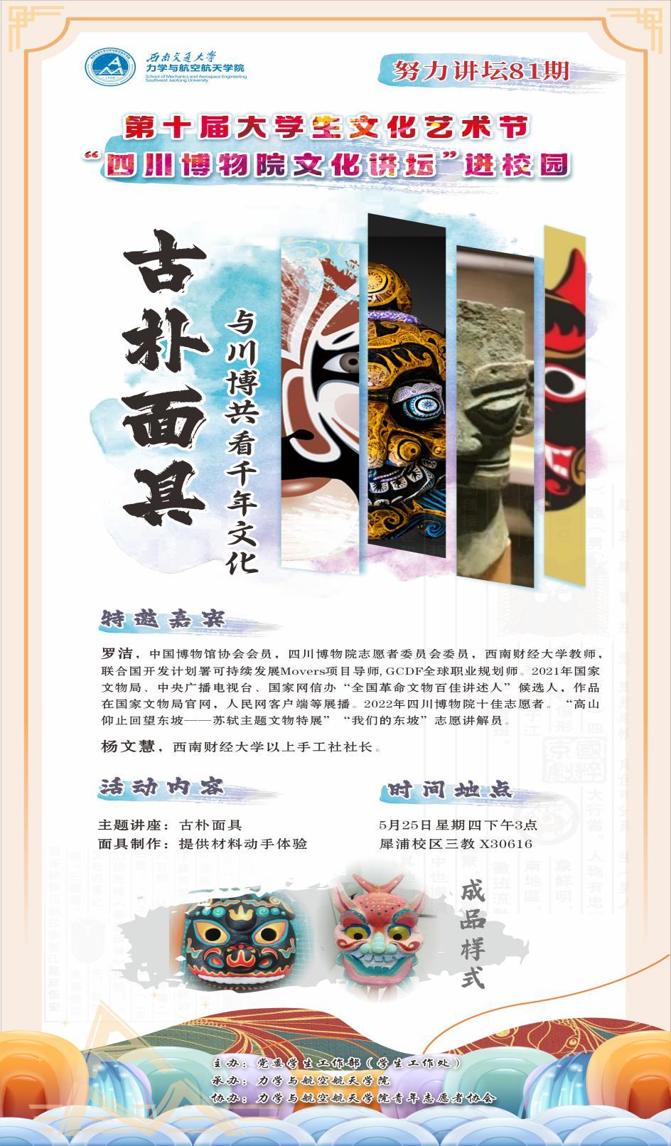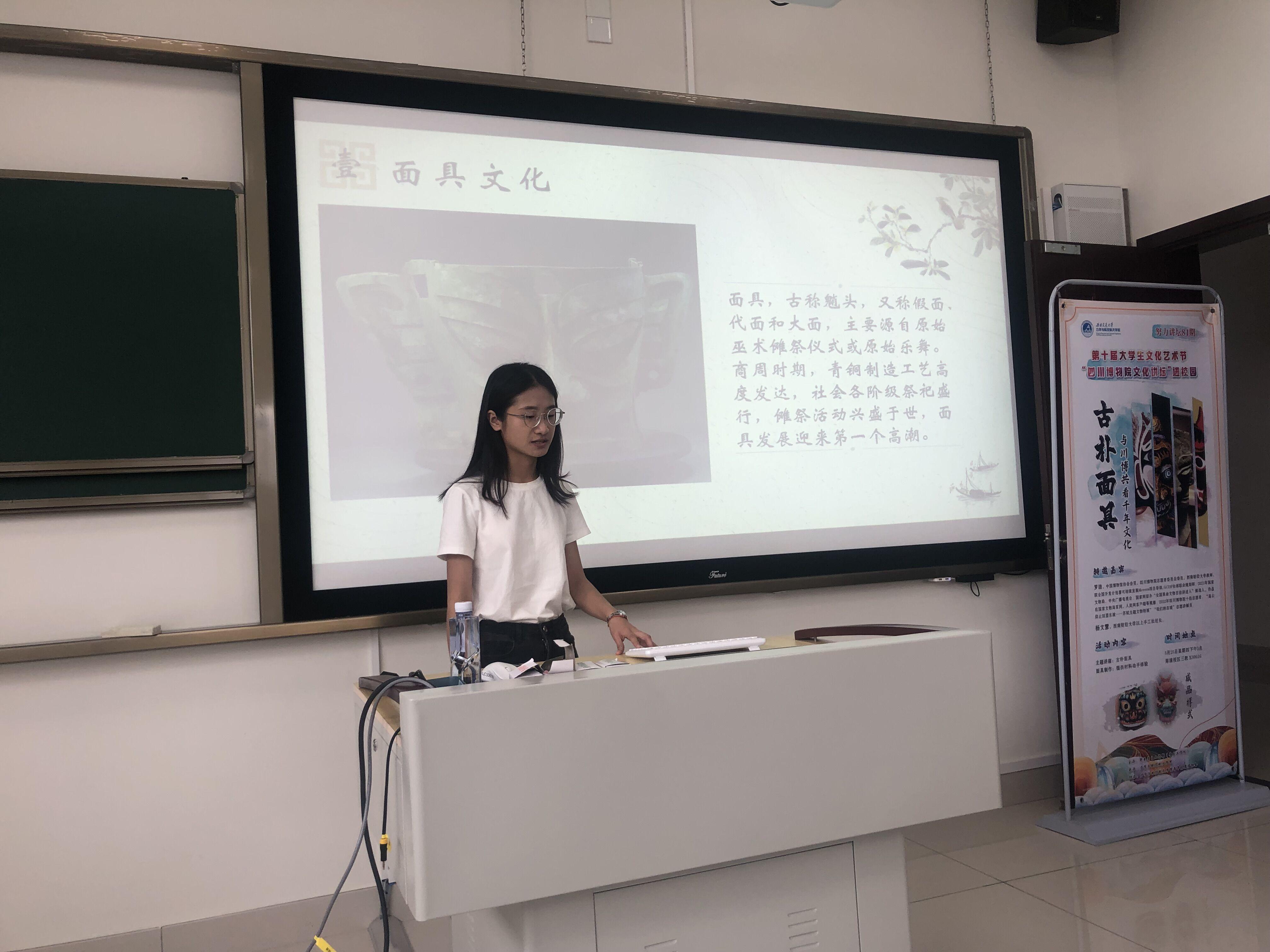 西南财经大学“以上手工社”社长杨文慧向大家介绍了古朴面具的文化背景。商周时期面具迎来第一个高潮,发展到宋元时代宫廷傩戏和民间傩戏流行,面具制作迎来第三个高峰。杨文慧为大家展示面具制作的过程,准备面具和超轻黏土,黏土造型,糊纸塑型,最后上色,一个古朴面具便呈现在大家面前。