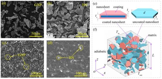 图2. 二维纳米片增强复合材料微结构的实验和数值表征:(a)-(b) 石墨烯和六方氮化硼纳米片的电镜扫描图;(c)-(d)石墨烯和六方氮化硼增强PDMS复合材料的微结构的电镜扫描图;(e)涂层和未涂层纳米片的特征尺寸;(f)混填纳米片增强复合材料微结构的代表性体积单元