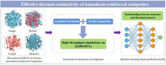 填充高导热的纳米填料是增强聚合物热导率的有效方式。在各种导热填料中,石墨烯、MXene、六方氮化硼等纳米片因其独特的二维结构被认为是最有前途的一类导热增强填料。然而,纳米片增强复合材料的微结构通常十分复杂,并且涉及众多的影响因素。由于纳米片大纵横比的二维特征,纳米片增强复合材料的微结构只能由大网格数的三维代表性体积单元表征。同时,复合材料中涉及大量的填料与基体间的热阻界面,且填料的热导率通常在基体的数千倍以上。这使得材料性能的理论分析和数值模拟都非常困难。因而目前关于二维纳米片增强复合材料中导热网络的热输运机理认识尚不清楚,也缺乏准确的预测模型。这给增强复合材料的制备、设计和优化带来了困扰。