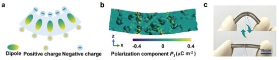 图1. a) 弯曲模态挠曲电效应;b) 多孔聚合物极化场仿真;c) 多孔聚合物传感器