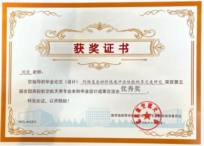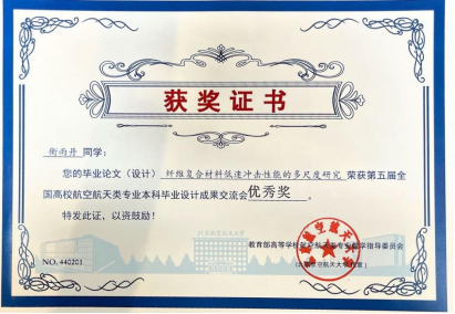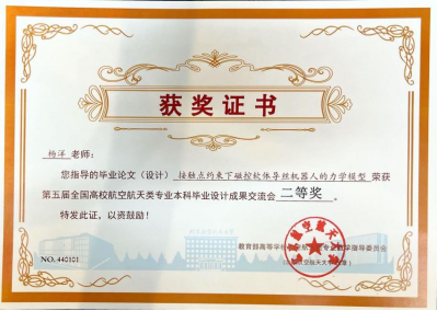 、海军航空大学、火箭军工程大学等20余所高校,300余名学生参赛。经过汇报人毕业成果汇报、现场演示、专家评议等环节,我院2020级飞行器设计与工程专业本科生谭丽丹的毕业论文“接触点约束下磁控软体导丝机器人的力学模型”(指导教师:杨洋 王柳)荣获二等奖,2020级飞行器设计与工程专业本科生衡雨丹的毕业论文“纤维复合材料低速冲击性能的多尺度研究”(指导教师:刘虎)荣获优秀奖。这是我们院首次获得全国高校航空航天类专业本科毕业设计成果交流会二等奖。