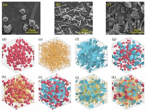 图2. 不同形状的导热填料的电镜扫描图(a-c)和重建的增强复合材料的代表性体积单元(d-k)