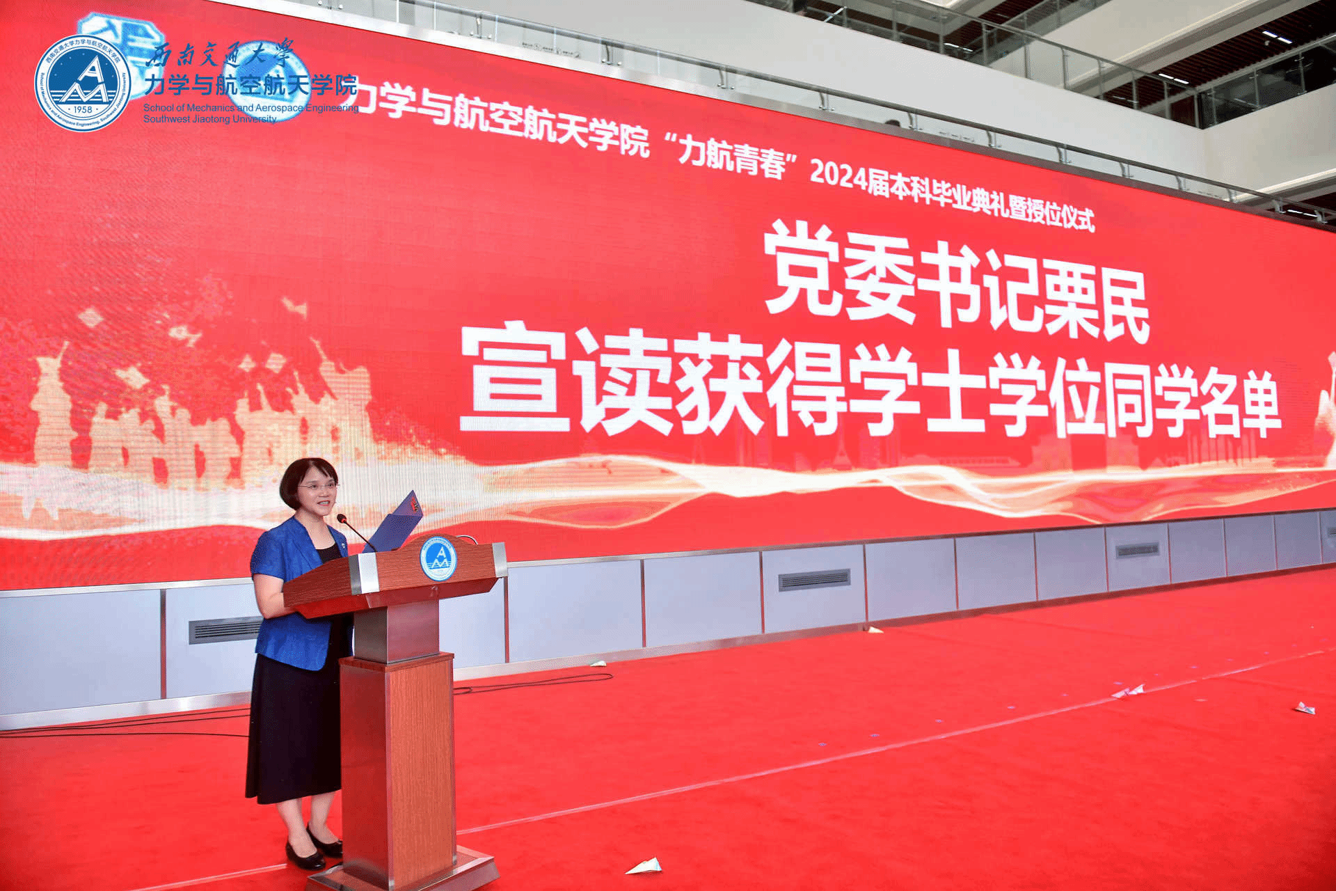 6月22日下午15:00,学院在犀浦校区3号教学楼中庭广场举行“力航青春”2024届本科生毕业典礼暨授位仪式。学院党委书记栗民、院长李翔宇等全体院领导、学院学位评定分委会和教授委员会成员、系主任、班导师、学工组、院机关代表及2024届全体本科毕业生及家长代表参加了典礼,典礼由学院党委副书记孔祥彬主持。