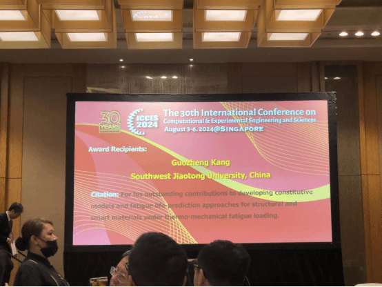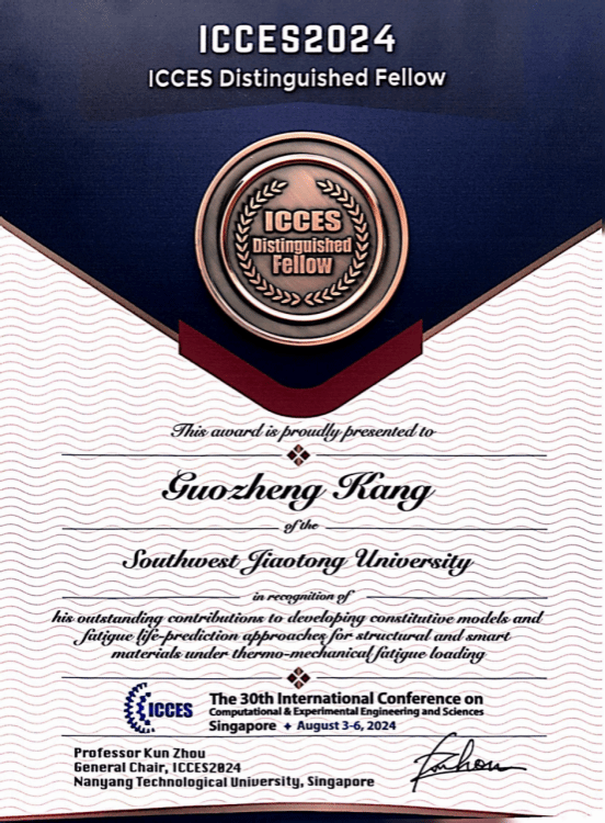 的康国政教授和四川大学的王清远教授。该奖主要是表彰康国政教授在热机械疲劳载荷下智能材料/结构本构模型和疲劳寿命预测方法方面做出的杰出贡献。