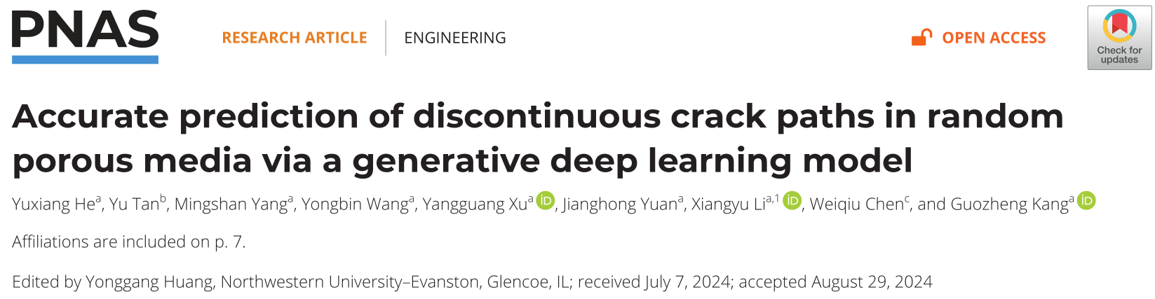 近日,我院博士研究生贺宇翔在《美国科学院刊》(Proceedings of the National Academy of Sciences of the United States of America, PNAS)上发表题为 “Accurate prediction of discontinuous crack paths in random porous media via a generative deep learning model”的研究论文。PNAS创刊于1914年,被公认为四大名刊之一(Nature、Science、Cell、PNAS),是被引用次数最多的综合学科文献之一。我院博士研究生贺宇翔为论文第一作者,李翔宇教授为通讯作者,91直播