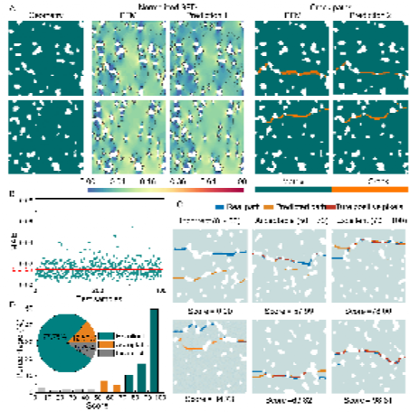 图3. 模型预测性能评估:(A)应变能密度(SED)和裂纹路径的预测结果;(B)400个随机多孔介质测试样品应变能密度预测结果的平均绝对误差(MAE);(C)裂纹路径预测结果的三个类别。基于得分将其分为:“Incorrect”、“Acceptable”以及“Excellent”;(D)测试数据集中400个样本的预测裂纹路径得分统计结果。