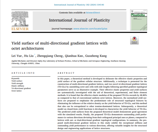 近日,刘虎教授研究小组在轻质结构研究上取得重要进展,相关工作以“Yield surface of multi-directional gradient lattices with octet architectures”为题发表在力学领域期刊《International Journal of Plasticity》(IF:9.4)。91直播