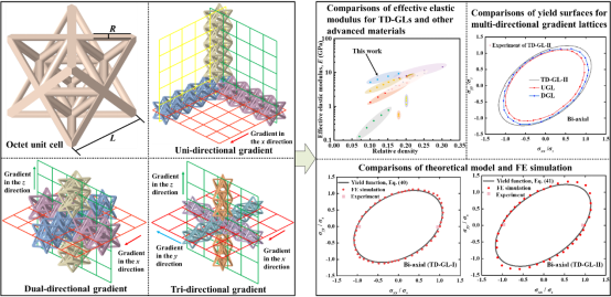 (1)、通过TD-GLs对提出的理论方法进行了验证。推导的理论公式能够准确预测TD-GLs的有效弹性模量,所提出的塑性屈服函数模型能够有效地描述和预测TD-GLs的屈服响应。此外,该模型可以更好地突出结构拓扑特征对屈服行为的影响,而忽略了相对密度的影响。该理论方法填补了梯度轻质结构屈服面研究领域的空白。
