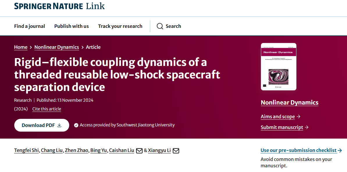 李翔宇教授课题组在航天器机构动力学方面取得进展,相关成果以“Rigid-flexible coupling dynamics of a threaded reusable low-shock spacecraft separation device”为题发表在动力学领域期刊《Nonlinear Dynamics》。91直播