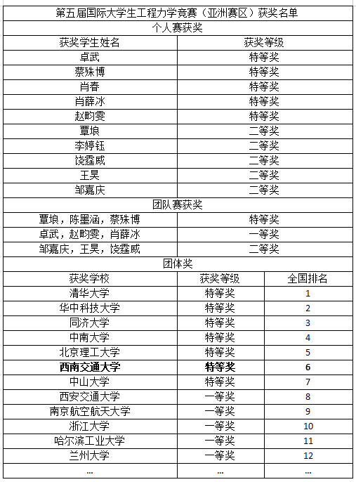 等69所高校的596位学生参赛本次竞赛。竞赛由国际大学生工程力学竞赛组委会委托白俄罗斯交通大学出题,试题内容为《理论力学》,采用全英文作答。本次竞赛分个人赛和团队赛两部分,我校共遴选了12名同学参赛。经过激烈角逐,我校学子从众多参赛选手中脱颖而出,取得优异成绩:在个人赛中,全亚洲共62项特等奖,我校学子斩获了5项(卓武、蔡殊博、肖春、肖薛冰、赵畇雯)。在团队赛中,获特等奖、一等奖及二等奖各1项;以卓武、蔡殊博、肖春为代表的91直播