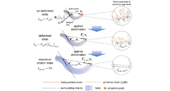 软弹性体(如天然橡胶、介电弹性体)已被广泛运用于各大工业与前沿制造领域,微观尺度上这一类材料由大量的聚合物分子链构成,得益于这些柔性聚合物分子链的熵弹性性质,材料具有高弹性的力学特征。基于上述微观解释,研究者们提出了一系列的基于物理机制的软弹性体超弹性本构模型。然而,近年来的研究表明,微观尺度上材料内部的分子链缠结会显著影响宏观上的力学性能,如材料刚性与可拉伸性,现有模型没有充分考虑缠结对分子链的影响,因此无法解释上述宏观实验结果。