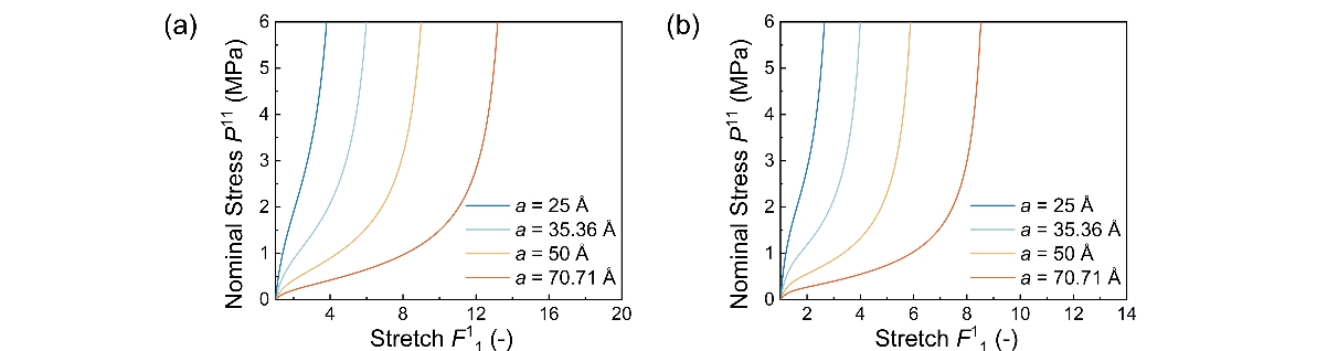 最后,基于该模型,本文讨论了缠结密度对软弹性体超弹性变形行为的影响。可以看出,随着缠结密度的降低,弹性体刚性降低,同时可拉伸性提高(图3),这一预测结果与现有实验结论一致,因此该模型解释了缠结效应对软弹性体超弹性变形影响的来源。