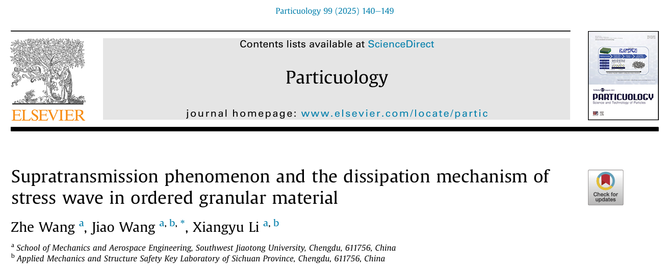 研究生王喆在颗粒材料能量超传递及应力波传播行为方面取得研究进展,相关成果以“Supratransmission phenomenon and the dissipation mechanism of stress wave in ordered granular material”为题发表在颗粒学领域期刊《Particuology》上。我院硕士研究生王喆为第一作者,王蕉副教授为通讯作者。
