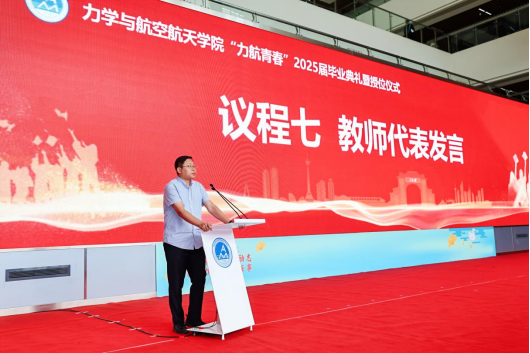 卓武同学作为本科生代表发言,他感谢四年里遇到的每一位老师和同学,愿与同学们一起,牢记和践行力航学院“严谨治学、严格要求”的双严传统,在奋斗中释放青春激情,为祖国建设添砖加瓦。