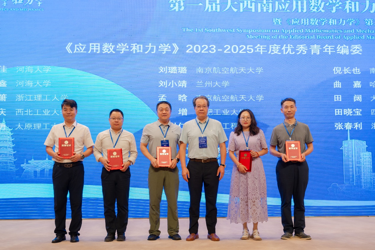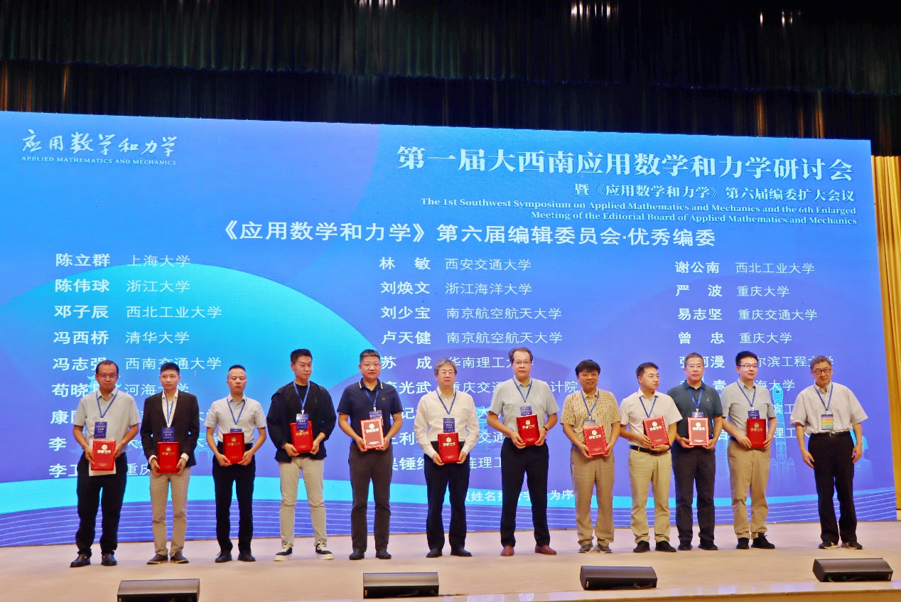 颁奖环节由重庆大学李卫国教授主持。中国力学学会理事长、中国科学院力学研究所何国威研究员为《应用数学和力学》第六届编辑委员会“优秀编委”获得者颁奖;期刊主编、南京航空航天大学卢天健教授为《应用数学和力学》2023-2025年度“优秀青年编委”颁发荣誉;期刊副主编、西北工业大学邓子辰教授为《应用数学和力学》2022-2024年度“钱伟长优秀论文”获得者颁奖。各项荣誉的颁发,既是对编审专家辛勤付出的充分肯定,也彰显了期刊对持续提升学术质量与影响力的专业追求。
