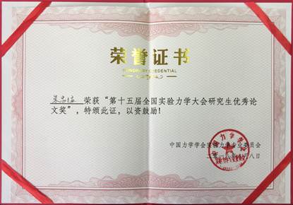 朱忠猛博士 “第15届全国实验力学大会研究生优秀论文奖”获奖证书