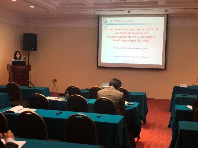 我院博士生邱博、徐祥和周廷参加了此次会议,并进行了分会场报告。邱博博士汇报了超弹性NiTi合金多轴率相关全寿命相变棘轮和疲劳寿命的实验研究,徐祥博士报告了考虑棘轮和疲劳交互作用的轮轨滚动接触疲劳预测方法,周廷博士介绍了形状记忆合金非比例加载的微平面本构模型。并且徐祥博士作为分会场主席主持了分会场报告。