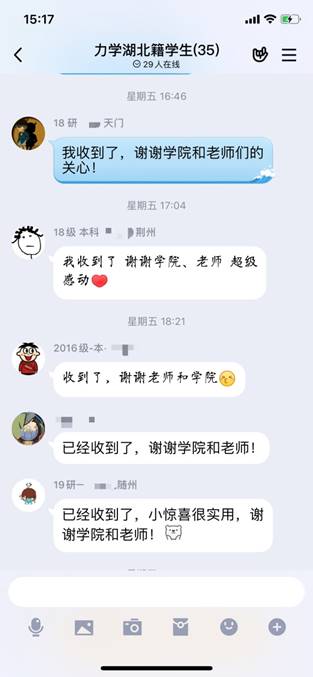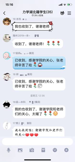 自疫情爆发以后,学院始终关心、关注着每一名湖北籍学子的情况,学院党政班子专题研究关心关爱湖北籍学生的工作,学院副书记第一时间电话联系每一位湖北籍同学,关心了解同学们及家人生活情况;各年级辅导员也利用电话、微信和QQ与他们保持密切联系和良好沟通,并组建了湖北籍学生QQ群,确保了解在鄂学子的健康状况、心理状态,让学生知道学院是他们的坚强后盾。
