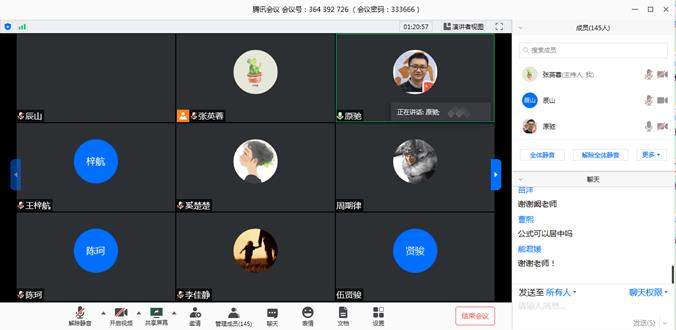 518日晚19:30,力学学院开展了2020届毕业生“建功立业新时代”云上动员会暨返校工作会。会议由学院团委副书记、研究生辅导员张英蓉老师主持,学校招就处就业管理科科长陈曦轶、学院副院长阚前华、学院党委副书记孔祥彬、学工组副组长杨婧、2016级本科生辅导员向金兰以及学院2020届的全体本、研学生参加了本次会议。