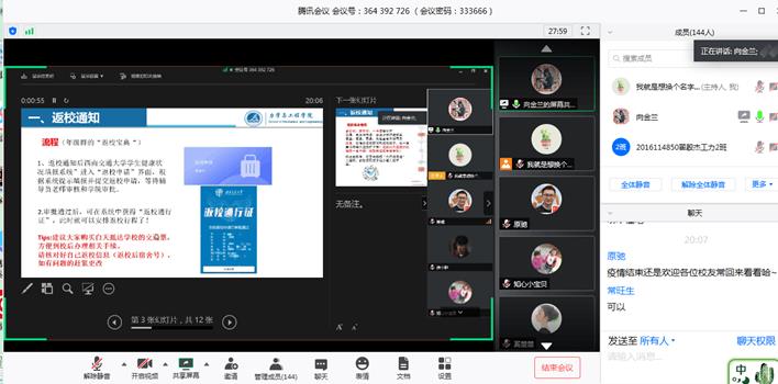 接着,研究生辅导员张英蓉老师、本科生辅导员向金兰老师分别强调了毕业、返校等相关事宜,尤其是对学生返校后的入校流程、安排、安全注意事项等进行了详细说明。