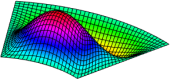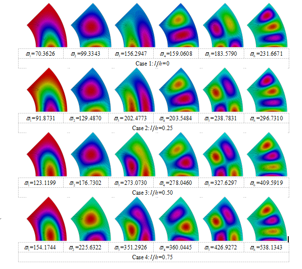 微分求积有限元法预测的四边简支环状扇形板的前6阶振动频率及模态:
