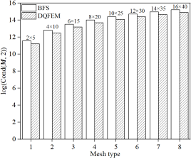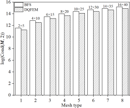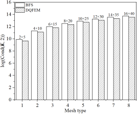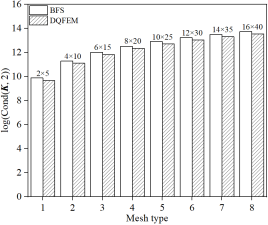 本文单元与著名的Bogner-Fox-Schmidt (BFS)四边形板单元(C1连续)所对应缩减刚度(或质量)矩阵条件数的对数比较:
