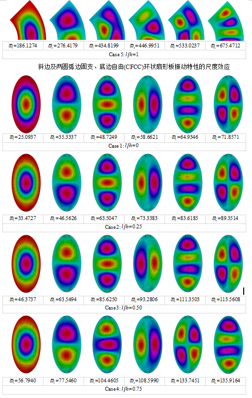 微分求积有限元法预测的四边固支环状扇形板的前6阶振动频率及模态如下: