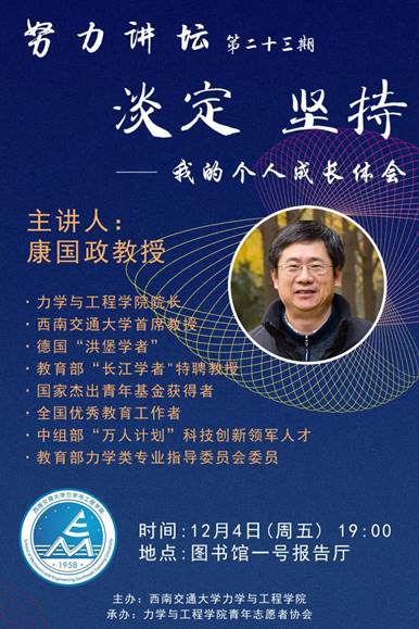 12月4日周五晚7:00,力学与工程学院院长康国政教授在犀浦校区图书馆一号报告厅为同学们开展“淡定 坚持——个人成长体会”专题讲座。学院党委副书记孔祥彬,学生工作组辅导员周子涵、黄冠翔以及力学学院2020级新生参加了讲座,讲座由谭丽丹同学主持。
