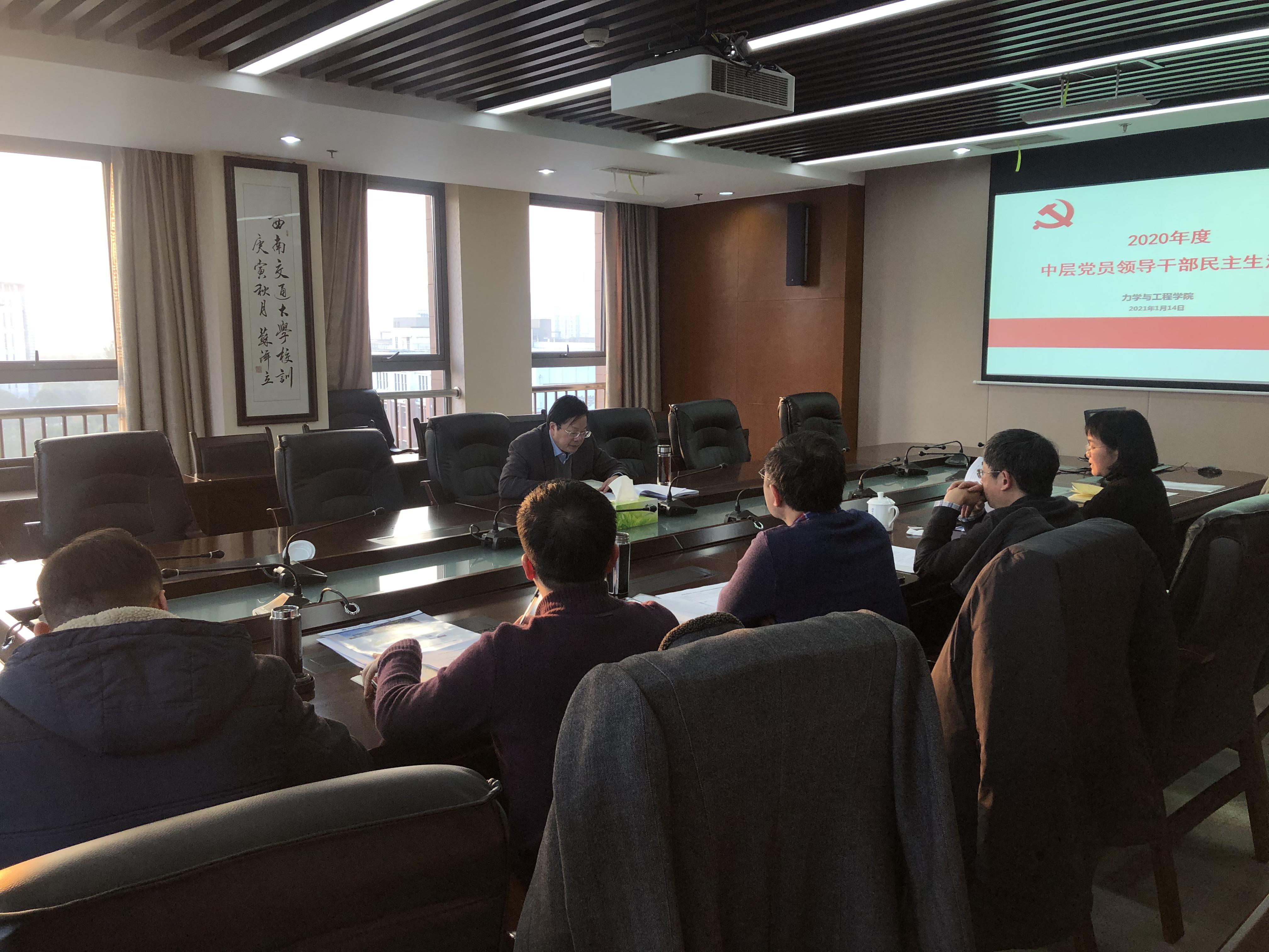 《关于认真开好2020年度中层党员领导干部民主生活会的通知》,力学与工程学院2020年度党员领导干部民主生活会于2021年1月14日下午17:30在犀浦校区综合楼611会议室召开。会议邀请校党委副书记沈火明和学校督察组段玉全参加。会议由学院党委书记栗民主持。