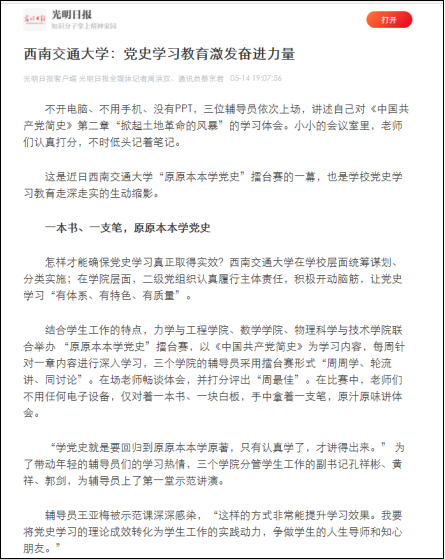 5月14日,《光明日报》以《91直播 :党史学习激发奋进力量》为题,报道了力学学院联合数学、物理学院开展的“原原本本学党史”辅导员党史学习擂台赛的创新做法。