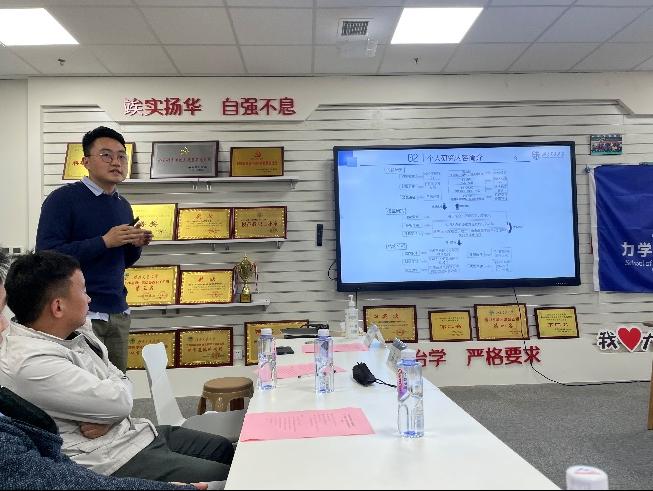 活动第二部分,来自力航学院阚前华老师团队的徐祥博士以“科研苦与乐”为主题,首先向大家介绍了其所在团队及个人情况,其次分享了自己科研的心路历程和实验、理论、有限元等方向的科研心得。分享内容丰富且实用,给在场的各研究生同学提供了十分有价值的参考。最后,徐祥博士强调,在科研进展较难时要及时调整心态,在攻坚难题时也要做一些容易出成果的研究。