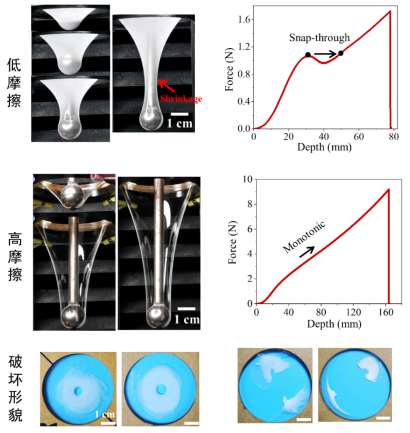 他们从实验中首次观察到软膜穿刺大变形中的“突跳”失稳现象,即软膜的穿刺力-位移曲线呈现出“N”型特征,并发展力学模型复现了该“突跳”失稳现象;发现了软膜穿刺过程中的变形形貌“颈缩”现象,并据此提出了一种测量软膜表面摩擦系数的新方法;发现了软膜表面的高摩擦使得软膜的临界穿刺力相比于低摩擦软膜提高了数倍,并揭示了该差异的力学机制:高摩擦能够缓解穿刺过程中软膜相对针尖的滑动,对针尖形成包裹,避免了软膜在针尖处的应力集中,从而延缓了软膜的穿刺破坏。该研究工作为理解软膜穿刺大变形规律,以及软膜穿刺破坏调控和抗穿刺设计提供了新的思路。