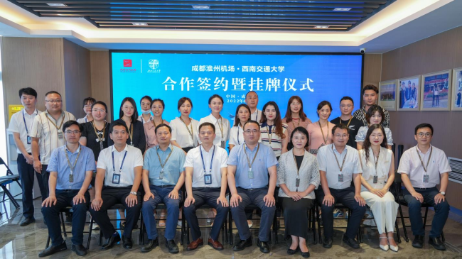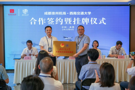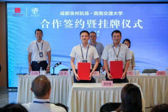与成都通用机场运营管理有限公司战略合作协议签订暨实践基地授牌仪式在成都淮州机场成功举行。西南交大校团委书记张军琪,力航学院党委书记栗民、执行院长李翔宇,机场公司党支部书记、董事长赵杰及双方各级领导、工作人员出席仪式,仪式由机场公司总经理王文韬主持。
