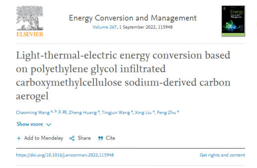 王朝明副教授研究团队在对碳基复合相变材料的能量转换方面的研究取得重要进展。相关工作以“Light-thermal-electric energy conversion based on polyethylene glycol infiltrated carboxymethylcellulose sodium-derived carbon aerogel”为题发表在能源科学领域顶级期刊《Energy Conversion and Management》(中科院一区TOP,IF:11.533)。王朝明副教授为第一作者和通讯作者,硕士研究生黄正为第二作者。