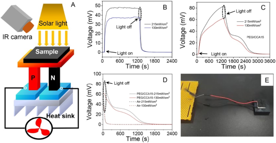 图3 PEG/CCA15复合相变材料优良的光-热-电转换性能