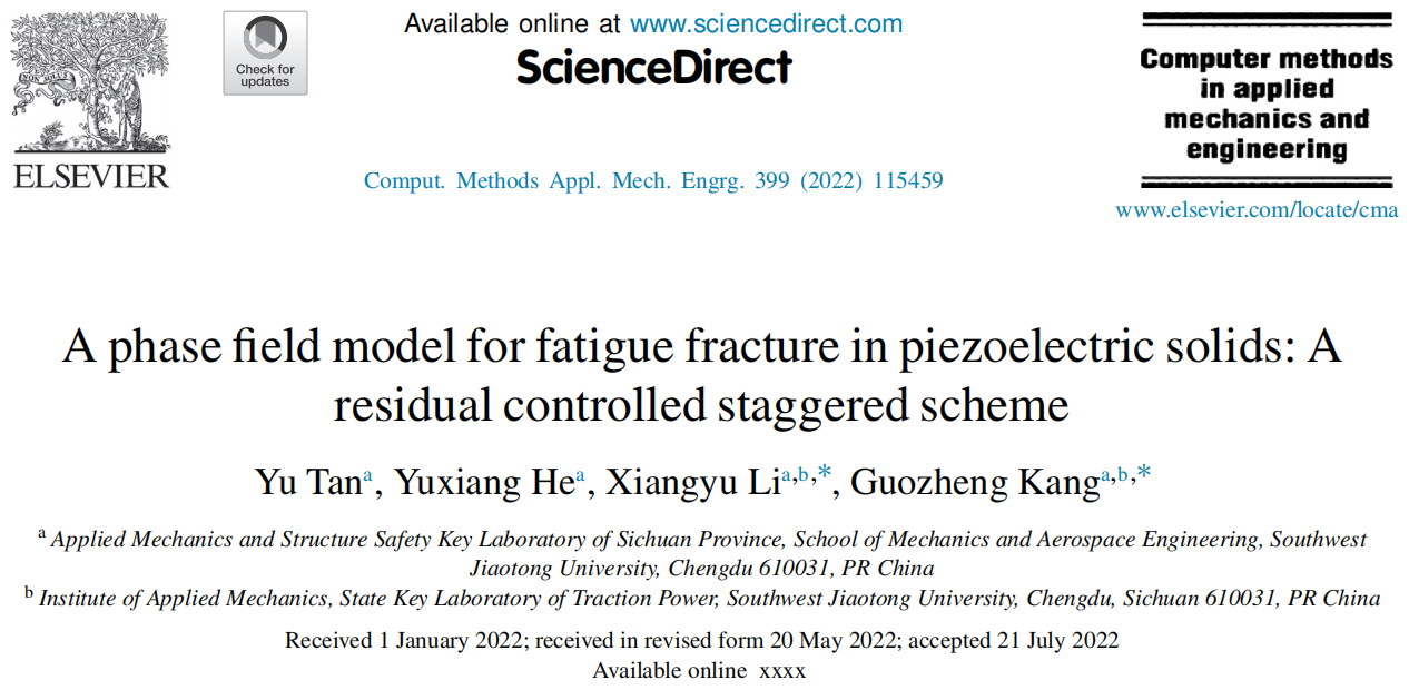 近日,计算力学顶级期刊《Computer Methods in Applied Mechanics and Engineering》(简称《CMAME》,中科院一区TOP,IF:6.588)在线发表了题为“A phase field model for fatigue fracture in piezoelectric solids: A residual controlled staggered scheme”的研究成果。论文共同通讯作者为李翔宇教授和康国政教授,博士研究生谭宇为论文第一作者,博士研究生贺宇翔为论文合作作者。