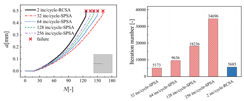 图2可控残差交替迭代算法(RCSA)与“一遍过”的交替迭代算法(SPSA)模拟结果对比:预测a-N曲线对比(a);所需迭代总数对比(b)
