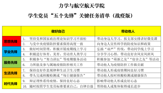 在疫情防控期间,力航学院党委向全体学生党员发出了争做学习战疫“五个先锋”的通知,号召全体学生党员以身作则,发挥党员的示范带动作用;迎难而上,发挥党员的先锋模范作用;抓好学习,落实学院“五个先锋”关键任务清单,并制定了《学生党员“五个先锋”关键任务清单(战疫版)》,要求学生党员们在做好疫情防控的同时,要带头上好网课,同时带动身边同学学习战“疫”,共同进步。