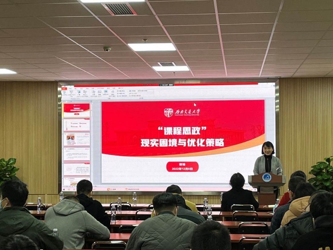 随后,谢瑜从“功以才成,业由才广,培养造就大批德才兼备的高素质人才,是国家和民族长远发展大计”为切入点,剖析了建设课程思政的必要性与重要性。她从认识、实践、方法和教师间的交流通道四个方面对当前课程思政实施过程中存在的诸多困境进行了分析,然后从深化思想认识、组织系统培训、构建同行学习机制和健全课程思政考核评估体系等方面给出了优化策略。